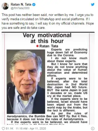 बिजनेस डेस्कः टाटा समूह के पूर्व चेयरमैन सोशल मीडिया के जरिए देशहित के मुद्दों पर अक्सर अपनी राय रखते रहते हैं लेकिन इन दिनों उनके नाम से सोशल मीडिया में वायरल हो रहे कोरोना वायरस महामारी से जुड़े एक फेक मैसेज (फर्जी पोस्ट) पर उन्हें सफाई देनी पड़ रही है। उन्होंने लोगों से इस लेख की सत्यता का पता लगाने को कहा है।